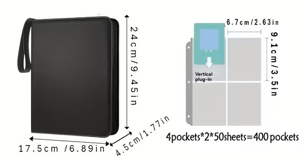 Stevige 3-ring binder met 50 transparante dubbelzijdige pagina’s voor 200 of 400 kaarten.